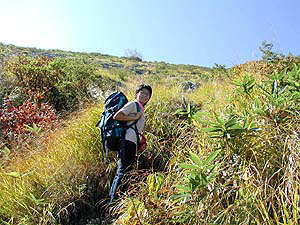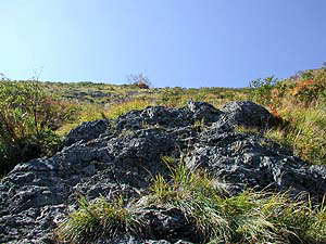 避難小屋からは結構キツイ登りが続きます。ブナ林の中を登りつめ、ようやく草原に出たかと思えばそこから最後の急登。風の強い日はそれなりに緊張しそうな場所でもあります。もっとも我々が行ったときは無風 or 微風快晴(見ればわかりますね)ゆえ、な〜んも問題なし。気持ちよく登りつめました。