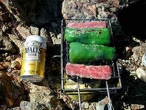 ここでいきなりザックから取りだしましたるは「霜降り牛肉」。焼き肉のタレも持ってきたし、ピーマンと合わせて焼いたり、アツアツ焼き肉をパンに挟んでホットサンドとしたり。いやぁ、至福でした。担ぎ上げたビール4本も適量。うむうむ。