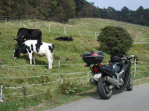 粕尾峠から脇に延びる道に右折して、前日光牧場まで。舗装とはいえあまり道はよくありません。ただ、牧場エリアにはいるとこんな風景もあったりします。まぁ牛さんがどこにいてくれるかは、彼らの気分次第ですけれどね。
