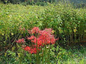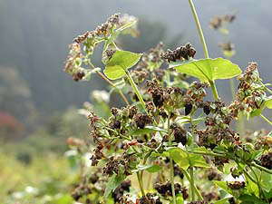 まだ彼岸花が咲いている、その後ろはびっしりと蕎麦の畑。よく見てみるとすでに実が色づき始めています。ところで、お蕎麦を食べたことのない人はまずいないでしょうが、花はともかく、実をしげしげと見たことのある人は案外多くないのでは?というわけで、実の部分をズームアップしてみました。右写真にマウスオンしてみてください。まだ色づく途中の赤い実なども一緒に写ってます。