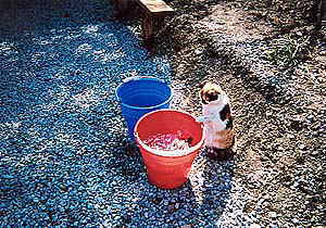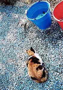 いつの間にか代わる代わる2匹のネコが我々の足元に。どうやらここの飼い猫みたい、とってもなついていてそれぞれかわいらしい。しかし、後から来たやつは、どうやら我々の釣り上げた魚の鎮座ましますバケツの中身にとっても興味があるらしい。とは言ってもあまり積極的に中身を奪い取ろうという姿勢は見られず、形容するならば「おっかなびっくり、でも好奇心旺盛なんだよね」という表現が一番のようだ。そこでわれわれも、かれの一挙手一投足をのんびりと眺めていたのであった。すると…。