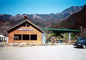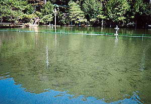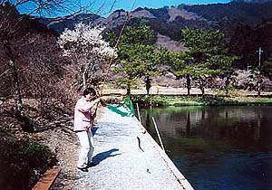 道路から一段あがったところにその釣り堀はあった。何とお客さんは誰もいないようだ。「よっしゃ釣り堀とはいえ貸し切りだ!」と、まずは気分をよくするTakema。エサと竿で400円、釣った鱒の塩焼き代100円、お持ち帰りは100g150円ということで、これは値段の割になかなか楽しめそうだと心ウキウキする。折しもポカポカの陽気、しかも右上の写真を見ればわかるように反対側には山が迫っていい雰囲気、そして池の中にはあまりにも元気なレインボー&ブラウントラウトがうようよしているのだ。