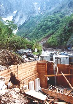 今回は5月中旬、まだ雪に埋もれた一の倉沢でしたが、一つ驚かされたことが。ここ一の倉沢も、これだけ人出が多くなると当然生理現象の問題を抜きにすることはできず、何年も前に立派なログハウスふうのトイレが新設されました。水洗の立派なものだったのですが、今回行ってみたらこのありさま。この春のなだれで完璧に破壊されてしまっていました。かなり堅牢そうな作りでしたし、場所も「ま、ここなら何とか雪崩の直撃は受けないだろうな」と思われるところにあったのですが、やはり自然の力は侮れないものです。