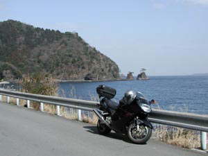 このような一大決心をした割に、当日朝の出発はいつもの出勤時間と同じ。やる気の度合いがばれてしまう。だって寒いんだもん。それに千葉県から伊豆は結構遠い。これまであまり伊豆に行ったことがなかったのも、わざわざ都心を経由して往復せにゃならぬというのを敬遠してのことだった。まあとにかく湾岸経由で首都高速、同神奈川線、東名高速、小田原厚木、西湘バイパス、真鶴道路、ビーチラインと乗り継ぐ。わかっちゃいるとはいえ、なんなんだこの有料道路のオンパレードは!58000円のハイカがあるからいちいち金を出すたびに腹を立てたわけではないが、真綿で首を絞められているような気分になる。これで渋滞でもしていようものなら「ちょっと待て日本の道路行政っ!」とぶち切れたりするところだが、さすがに横浜を越えれば車は少ない。ビーチラインでは最初から最後まで完全にソロでのんびりと走れたんでまあよしとしよう。