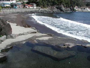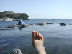 景色は絶好だ。正面は海、左手は砂浜。背後には生垣があるので国道からは全く見えない。ただ、砂浜にいる人からは丸見えだけれど、まあそれは仕方がないね。湯船はコケがという話だったが、掃除がなされているのか、ヌルヌル感は皆無。数枚の落ち葉が紛れ込んではいたが、それとて趣を害するもんじゃない。お湯はほんの少しぬるいくらいでちょうどいい。もっともこの日はそれなりに暖かくもあったので、真冬、風がピューピューの日はちとぬるく感じるかもしれない。とにかく、ここ数時間誰も入った形跡もない湯船に足を沈めてまったりと過ごす。ビール飲み物を持参しなかったのは失敗だったが、まぁいいっしょ。