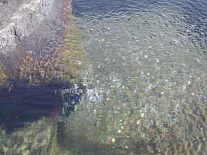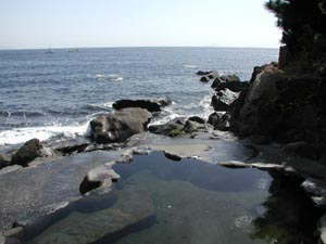さて、最初の目的地、赤沢温泉とやらに到着。近くのGSのおばちゃんは、「あそこかい、あそこは露天風呂っていうよりはお湯のたまり場という感じでねえ、中はコケでぬるぬるしてるよぉ」ということで、そのスタンドから少し先の海岸に「露天風呂」と大書された温泉を紹介してもくれたのだが、ここまで来て、そこに入ってさぁおしまいよというのではあまりにC/Pの割に合わないツーリングになってしまうと思い、初心通り赤沢に来たのだ。で、風呂を見てみると…。
