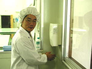 写真左:当然埃や雑菌には細心の注意が払われる。手にアルコールを噴射しないとドアは開かない。