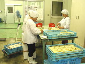 写真右:この日唯一お仕事をなさっていたパック詰めの方々。ずっと立ちながらの作業、ご苦労様です。