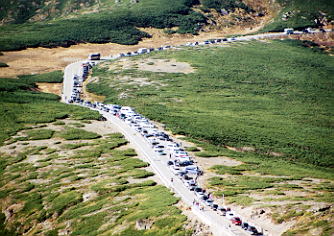 せっかくいい天気だし、ここまで登ってきたんだからということで、本峰頂上は時間的に無理だから手みじかの大黒岳(それでも2771m!)を往復してくる。残念ながら槍穂高方面だけはガスがかかっていて展望ゼロ。おしいなーっ。そして眼下に眼を転ずると、そこには信州側・岐阜側ともに大渋滞の車列が連なっていたのであった。うほーおそろしやおそろしや。