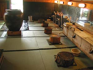 入り口から渡り廊下をてけてけと歩いていき、途中の玄関で靴を脱ぎます。浴室のある建物はまだ結構新しく、何となく木の香りもする落ち着いた雰囲気です。男湯と女湯は確か日替わりで変わります。「猿岩窟」と「亀仙人」だったっけ、あれ、忘れた。「亀・・」じゃなかったかも。浴室はどちらも木をふんだんに使った作りで、天井は高いし、いい感じです。どちらの場合も真ん中に置かれた大きなかめに荒塩がたっぷりと詰められており、それで体をこするとなんだか因幡の白ウサギになれるような気がして(笑)おもしろいのです。で、それぞれこんな感じ。