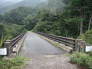 この日の天気はものすごく不安定。テントを張った水上近くの某エリアはしっかり晴れていましたが、四万温泉に向かう道中はどしゃぶりになったりやんだりの繰り返し。でも幸いここは今のところ雨は降っていない。なんとかこのまま降らないでくれると嬉しいなと思いながら林道をぽくぽく歩いていたら、5分ほどで立派な橋(湯の泉橋)に出ました。この橋の名前からしてもうそろそろかなぁと思っていたら、ほんの一投足で温泉はいきなり出没したのであります。