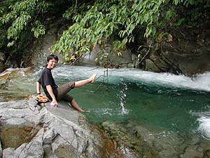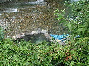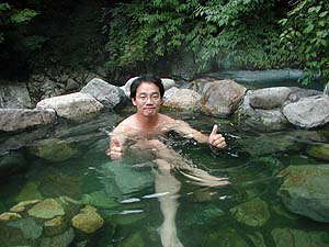 林道のすぐ下に立派な湯組み発見。風呂のすぐ横はまさに清流と呼ぶにふさわしい沢が流れていて、ロケーションは最高。人出は‥入浴中の人が一人、川の横でくつろいでいる人が4人くらい。でもここに来る途中で2組6人とすれ違ったから、さっきまでは結構混んでいたんだな。あ〜良かった。さ、お風呂お風呂と。