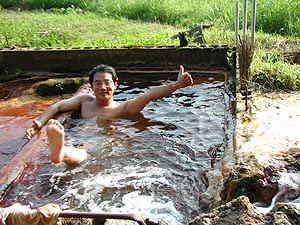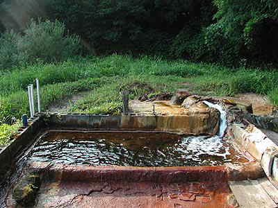 八九郎温泉群の「長男」、八九郎温泉は集落のはずれにあります。林道が分岐する場所からさほど遠くないところにある民家のすぐ前を入っていくのですが、その「民家」の方が管理をされていますので、入浴の際は必ず一言ことわってから奥に進みましょう。その民家の場所がわからない方は、しばらく戻ったところにある商店で場所を聞けば、親切に教えてくれます。わたしらは「入らせてもらう」立場なのですから、このへんの礼儀は是非きちんとしたいところです。