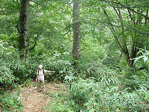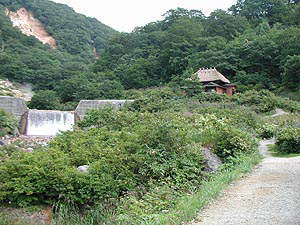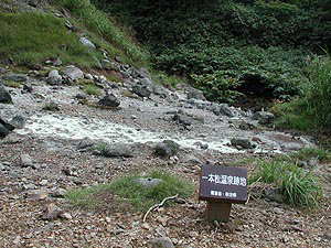 まずは河原まで一気に降り、そこから上流に向けて歩き始めます。もともと乳頭山への登山道ですから道はしっかりしていますし、自分は2回ほどこの道を歩いたことがあったはずなのに、その道沿いにある温泉に気づかなかったのは余りに不思議。たしかに当時は温泉目当ての山歩きじゃなかったんだけれどなぁ(ネマガリタケのタケノコ目当てでした。新鮮そのものでうまかったなぁ、ただし皮むきの手間はうちの母に任せたんだっけ。今さらながらごめんなさい)。