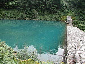 最初は緩い傾斜で沢の一段上の道を歩いていきます。少し傾斜が急になったと思ったら、堰堤を乗り越えるための登りでした。たまった水は上の写真のような碧色、きれいなもんです。ただこの深さでこういう色になるということはそれなりに含有物(硫黄系?)があるということでしょうから、汲んで飲むのはおすすめしませんけれど。泳ぐにゃ冷たいしねぇ。