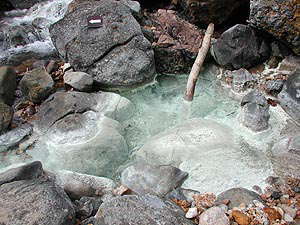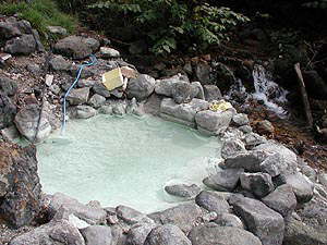 看板には「一本松温泉跡地」と記されています。看板周辺のあちこちには小さなお湯の湧出が見られます。みんな熱いのだけれど、でもいかんせん量が少なく、さらに湧出エリアの半径が30-40cmというのでは「お風呂」にはできないでしょう。これが登山道側の「温泉」です。