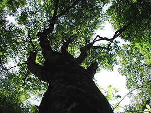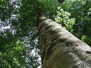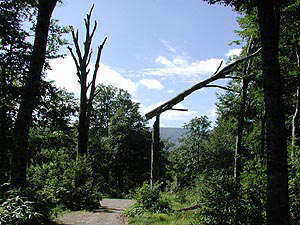 急な坂を下ること7-8分で、ロープで厳重に?くくられたゲートが出てきます。そこをさらに進みます。あたりは広葉樹の美林で、大きなブナもあちこちに現れ、なかなかきれいなものです。