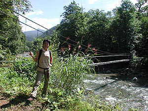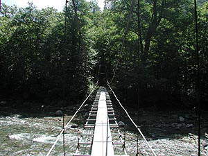 小さな沢を2度ほど横切り、大きな沢をコンクリートの橋で渡り、さらに下っていくといよいよ玉川の本流に降り立ちます。そこからしばし段丘の上を歩いていくと、いよいよ吊り橋に到着です。