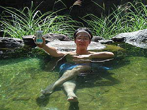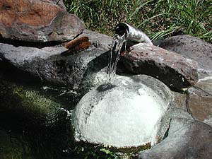 ありましたありました。広めの湯船にお湯がこんこんと流し込まれています。適量の水も注がれていることもあってほぼ適温(ただしちょっとぬるめ)。よっしゃぁ入浴!と思って入ったら、湯船内は緑色のコケがびっしり。滑りやすいことおびただしいぞ状態になってました。ただし、「人間が入ると湯が緑色に染まる」などということは一切なく、案外に快適。まぁ、時間があればテッテー的に掃除(ちゃんとタワシやデッキブラシも置いてありました)できるでしょうね。結局やりませんでしたが。