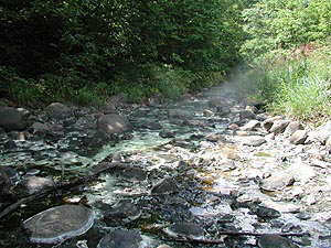 さて、この湯船のすぐ下には、本流とは別の小沢が流れています。とはいってもこの小沢、流れているのは全て熱湯に近いアツアツの湯。水がないですから入浴は不可能ですね。まぁすごい場所にある温泉、場所が場所(&設置者が設置者)ですから、今後ともこの姿のまま維持されていくんじゃないかと思います。大人数で来たら、今度はコケ掃除でもしたいもんだと思いつつ、「見張りの湯」をあとにしました。はい、再び標高差250mを登ってです‥。
