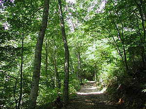 道は基本的に下るいっぽう。平らな部分はほとんどありません。ということは、帰りはお湯で火照った身体のままこの坂を登らなきゃいけないのね。道は林道ですからのんびり歩けるのですけれど、少々憂鬱な話です。