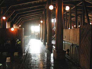 まずは内湯に入ります。以前は混浴だった大浴場、大幅にリニューアルされて男女別になっていました。朝の中途半端な時間だからか浴場内は比較的(いや、かなり)空いていて、全部で10人くらいしかいなかったでしょうか。おかげで「源泉100%」の浴槽は貸し切り状態。しばらく入っていると何だか身体がちくちくしてきます。アブに食われた場所なんかもひりひり。さすが強酸性です。飲泉も飲み放題(大量に飲むものじゃないですが。ちなみに水でかなり薄めても苦いです。そりゃそうだ)。ただ、脱衣場の但し書きに「一度に長く入るものじゃありません」とあったので、適当なところで上がりました。