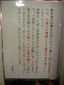 難癖をつける人がいるのか、こんなまぬけな但し書きもありました。「水で割る」必然性などないって。だって源泉の湯、使い切れずに大量に余ってるんだもの。