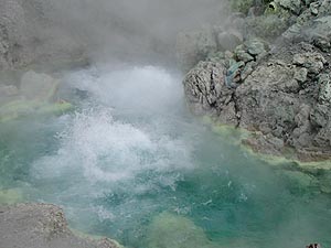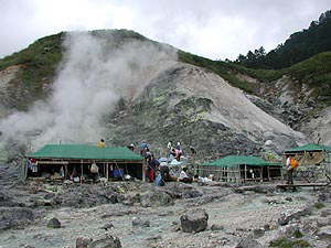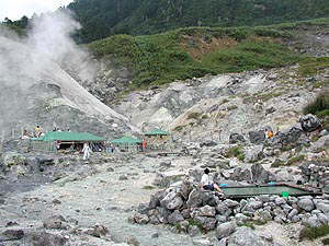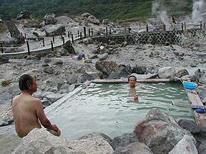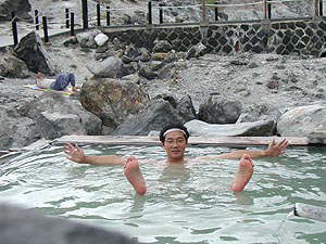ここ玉川温泉は「万病に効く、特にアトピーや癌によ〜く効く」とかいうことでいつも賑わっている場所です。時期によっては1年前にもう予約が一杯になることもあるとかいうことですから、その人気はある種すさまじいモノがあります(とはいっても、訪ねた日は旅館部の入口に「本日空室あります」の看板が出ていましたが)。強酸性(強酸性塩化物泉、ph1.2)の湯は宿から少し離れたあたりでごうごうとものすごい勢いであふれているわけですね(毎分8700リットルだったっけ?)。