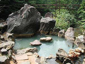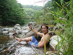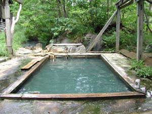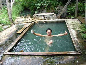 さてとりあえずゆったりした後は、すぐ脇を流れる清流駒込川で心地よい風に吹かれてくつろぎたいところですが、使われずに余った源泉がそのまま川に流れ込んでいる場所を発見!こうなったらここにも入っとかなくちゃという貧乏根性が頭をもたげます。しかし底面を掘り広げて快適に入ろうなどという積極性は一切なし。だってすぐそこに立派な露天風呂があるしね。というわけで、ただ座り込んだだけで満足することにしました。