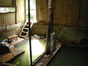 二階屋の建物が2棟、そのうちの一軒が内湯となっており、その外に露天風呂もあります。他にもいくつか湯船があったりしますが、うちらの時は熱くて入れませんでした。なんでも有志の方々がここを清掃・維持管理して下さっているとのことで、確かに内湯の建物内部には崩壊を防ぐためのつっかえ棒があったり、内壁を補修した跡などもありましたから、全くもって感謝するばかりです。しかしこのあたりは名にし負う豪雪地帯ゆえ、いつかはこの内湯棟も倒壊してしまうのではないかと気にかかります。