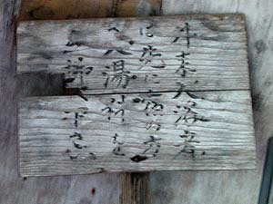 内湯は2漕からなっていてどちらも適温(ちょいと熱め)、気持ちがいいです。左上の写真のカメラ側後方には脱衣場(男女別)がありましたが、浴室は昔から混浴だったのでしょうし、ここまで来て男女混浴にこだわる人はいなかったのでしょうなぁ。出湯量はかなり多いようです。ちなみに、玄関側にかつてこの宿が営業していた際に掲示されていたはずの立て札を発見。当時の入湯料がいくらだったのか気になるところです。