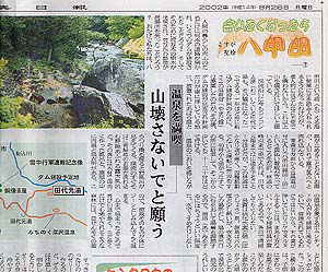 新客さんのお一人いわく、「実はここの温泉が地元の新聞に紹介されていて、それを見て来てみたんですよ」とのことでした。なるほど、ローカル紙とはいえ新聞の威力は大きいですな。でも裏を返せば、「新聞に載ってもこれくらいの人出」ともいえるわけで、やはり関東近辺との周辺人口の違いをうらやましく思わざるを得ませんでした。ちなみにその新聞とは「東奥日報」。2002年8月26日の朝刊でした。このあとその現物を入手しましたので、ちょいと載せておきます。読めないけれど許してね。