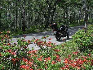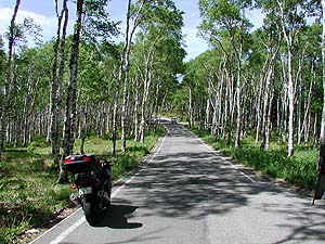 地名の通り白樺が一面に生え、その下生えにヤマツツジがちょうど花の見頃をむかえている。車の音もなくただ静かだ。しばらくぼ〜っとするのにはとてつもなくいい場所なのだ。テントを張ることが出来るなら、そして水さえ持参すればいい一夜を過ごせそうだ。