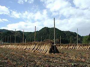 ん?「なぁ〜んだ、稲を干してるだけじゃないかよ!」としったかブッダ系のおにいちゃんおねえちゃんは、ここからは生恥さらすだけだから黙ってなさいね。こちらは稲じゃなくて蕎麦の実干しの現場なのですよ。「え、お米でお蕎麦ができるのぉ?」などと発するおねえちゃんは、もうこのへんでこのページ見るのやめて下さいね。ちなみに、上の写真にマウスポインタをのせるとアップ写真が出ますし、こちらをクリックしてもらえると刈り取り前の蕎麦写真のあるページに飛べますよ。