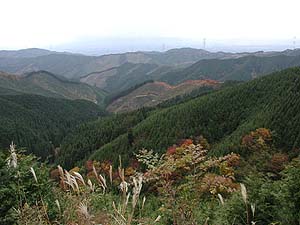 というわけで、栃木側の道から見える景色はご覧のように「針葉樹の緑か伐採跡地」というさびしい状況です。ちょっと遠くの山の尾根上に、わずかに残った広葉樹の赤が見えています。昔はこのあたりも一面に広葉樹の森が広がっていたんでしょう。何だか殺風景でさびしいなぁ。