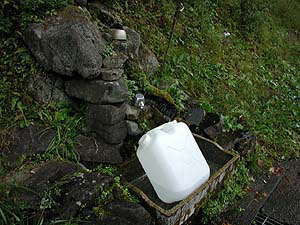 さて、八溝山を茨城側に下りた最初の集落には「おいしい水」を組めるところが2箇所ほどあります。そうそう、今日の最大の目的は「水汲み」だったんです。バイクのリアシートには20リットルのポリタンクをくくりつけてきたんです。というわけで、すぐ向かいのミニ売店のおじさんに一言ことわってから(ついでに里芋のミソ焼きをほおばりました)お仕事開始。