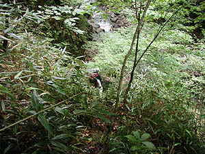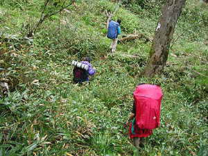 温泉への分岐(看板あり)からは、一気に斜面を下ります。結構急で、道ははっきりしてるんですけれど、「帰りはここを登るのかぁ」とブルーな気分になります。標高差は80mくらい。まぁ何はともあれ河原に降りたって、さぁここからがいよいよ本番です。