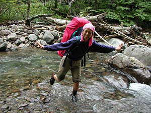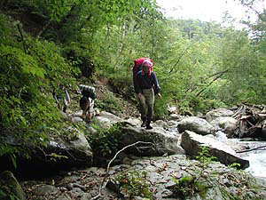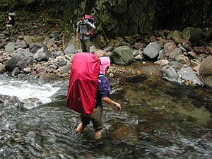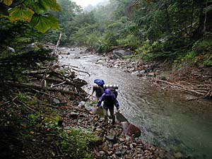実は、ここに来るまでにいくつかネットで検索した結果、「温泉まではほんの数回渡渉(川渡り)をするだけで、あとはまがりなりにも道がついてるんじゃないか」とタカをくくっていました。できれば靴を濡らしたくないなぁ、その時だけビーサンに履きかえればいいかと思っていたわけです。しかし、現実はその淡い願望を見事にうち砕いてくれました。道など無いのです。歩けそうなところを選んでとにかく進むのみ。滝こそありませんが、こりゃぁ純粋な沢歩きそのものです。