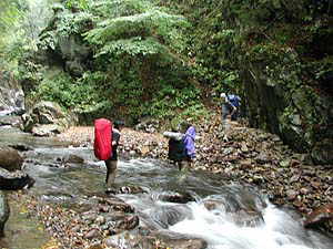 結局膝下までの渡渉10数回、かなりあてにならない、木々に巻かれたテープによる(みんな好き勝手につけてる)ルートをたどりながらの沢歩きとなりました。しかし不思議なことに、上流に行けば行くほど歩きやすくなっていくのは不思議な感じです。