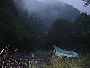 そして何とか、暗くなる前に通称「広河原」に到着。数張りは張れるであろうテントサイト、そしてその少し下流にある温泉。絶妙のシチュエーションに陶然としながら、まずはテントの設営です。今回は天気が悪いというのがわかっていたので、バイクキャンプ用の巨大タープを持参していましたから、雨が降ろうが何だろうが恐いものはありません。実際、夜は結構霧雨も降ったりしていましたから、これなしではきつかったでしょう。持ってきて良かった♪。