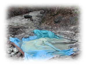 しかし、Takemaは以前何の予備知識もなしにここに来て、「それでもどっかに湯が湧きだしていないだろうか」などと周辺を探り、期待通りに「入浴」を果たしたことがあったのだ(この時のデータについてはこちら)。そして今回はおしんこどん@妻と一緒なのだが、ここには当然脱衣場等というしゃれたものはない。それどころか、湯船がなければ自分で作るしかないのだ。まぁGWということもあり湯船が流されたままになってるということはないだろうが、まぁ当然先客が入浴中だろう。そう思っていた。し、しかし。