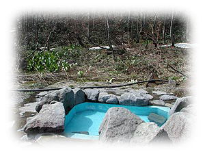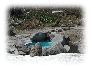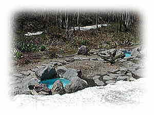 ここのお風呂、実は露天風呂であるのはもちろん、その湯船が4つに別れているのです。従って、グループで入りに来ても、4グループまでは貸し切り気分が味わえるわけで、でもそんなに混むことはそうそうないということで、結局はいつ行っても貸し切り湯船が堪能できるわけですね。お湯はいつでも熱い=水でうめる必要あり、だからこそ、循環系のカルキ臭などは縁遠い話。しかも、男湯の場合、すぐ下にはミズバショウの群落あり(写真)。さらに今回の場合右上写真の手前は雪が残っていて、次の湯船に移動するのに「あ〜熱い、さ、移動だ、あ゛っ冷たいっ!でも歩かなきゃ次の湯船に行けないっ、うわっ足が潜ったっ!つっ冷たぁっ!はぁやっと着いたぁ、ジャボッ、あっ熱っう!」的な、他人には言えないコーフン状態が味わえるというわけですね。