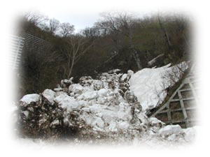 里のあたりではちょうどこの時期が桜の盛り。桜にしてはやや濃い桃色、今まさに満開、されど見る人もなしって感じで咲き誇っている。里の集落から離れてさらに標高を上げていくと、今度は何ヶ所かで雪崩のあと。一旦除雪したあとに落ちたもののようだが、1つ1つのブロックがなかなか大きい。さすがに春の雪崩だなぁと妙なところで感心してしまう。