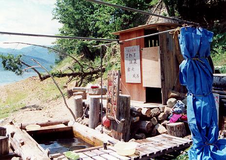 ここは数年前彗星のように現れ、そして消えていった温泉なんで、知ってる(行ったことのある)人も多いんじゃないかなあ。昨年版のマップルにも載ってますが、現地で聞いたら「取り壊したよ」ということなんで、ま、今となっては幻なんでしょう。場所は糠平湖畔、三国峠に向かう国道の反対側で、林道をわっせわっせと入っていくわけです。そうするとひょんなところにぽつんとあったわけですね。今となっては申し訳ないのですが、ここにテント張って一泊してしまいました(やっぱりいけないんだろうなあ)。温泉は100%源泉、水増しなしという代物で、湯船にコケがつくのを防ぐために、「入り終わったら湯を抜いて洗ってから帰ること」という注意書きがありました。お湯は本当にちょうど良かったなあ。すぐ横に大きな釜(?)がころがっていて、これに入ることもできました。本当に湖の岸から10mちょいくらいのところにあって、湖面を眺めながら入る気分は最高。夜、テントを張って何人かで宴会を始め、もう一回お風呂入って寝る、という幸せな生活を楽しみました。そういえ ば、夜中、何だか変な物音がするのでテントをあけてみたら、えぞ鹿の群が一気にドドッドドッと逃げていったなあ。何とも言えず野趣豊かな温泉でした。何だか今は構造物は一切なく、ただお湯だけが垂れ流しになっているとかいう話でしたが、どうなっているのやら。知っている方がおりましたら教えて下さいな。そういえば、ここの閉鎖の理由は「国立公園内に許可なく建造物を建てた」ということだったらしいです。
