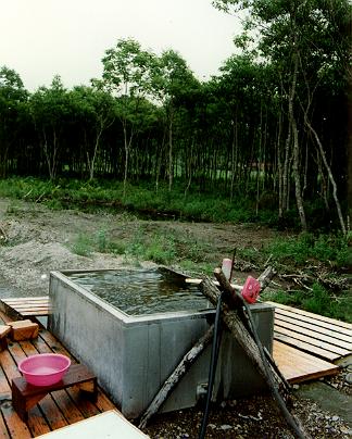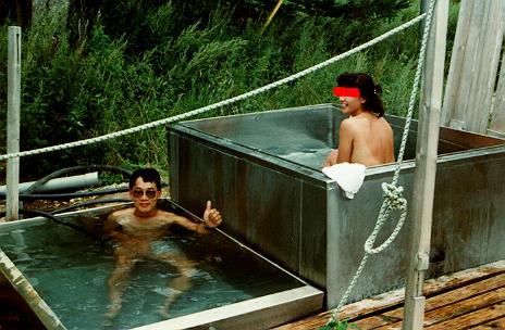 これも奇怪な温泉だったなあ。昨年版(1998)のマップルにも「奥摩周温泉」って載ってますよね。で、そのマークのある場所はR241のすぐ南側。よし行ってみるか!と国道から直線ダートを約100m。そこから奥は「奥摩周文化村」っていったか、芸術家達のアトリエ兼自宅らしいものがいくつもあるみたいなんだけれど、とにかくその入り口にそれはありました。お湯と水とを自分たちで入れるシステム。家庭用にしちゃ大きいステンレス浴槽が大小会わせて2個無造作に置いてあるだけ。勝手にやってくれってことなんですが、とにかく国道から丸見え。でも、国道走ってるライダー達はどんどん通り過ぎて行くばかり。「ふっふっ周囲の景色に注意していないから気づかないんだよ」とちょっとした優越感に浸りながら湯につかる。そうそう、この時はご夫婦の旅行者が入りに来て、なぜか奥さんだけが入ったのだ。もちろんこの写真を公開する許可は得ていないから顔は隠しておきますが、なんだか人妻とお風呂入ってる写真を、その夫に撮ってもらうという、一種不思議な体験でした。嬉 しかったけど(しょーがないなあ(^_^;))。ちなみに1998夏現在、跡形もありませんでしたから完全に撤去しちゃったんでしょうね。残念。