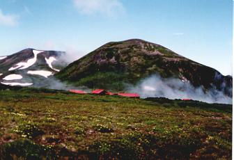 黒岳の小屋まで降りる。ここはもう雲上の別世界。風もないし、景色はいいし、もう気分は最高。そしてここからはお鉢平の中を気分良く歩くことに。雪は多いし、人はいないし、花は多いしで、完璧なまでの夏山登山を満喫する。