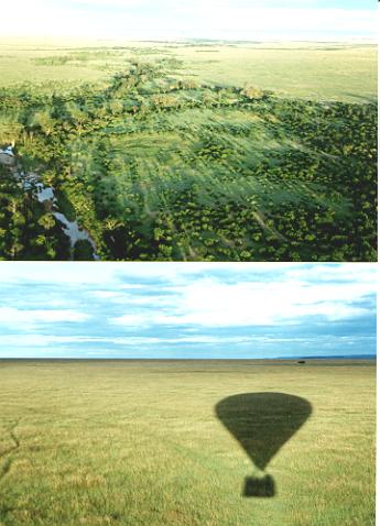 上からは動物たちが小さく見える。空からの不思議な来訪者に逃げ出すトムソンガゼルやインパラの群れ、のそのそと歩いている一匹の雄ライオン、そして遙か彼方までずっと続く大平原。国境線は見えない。人間の作ったものは何一つ見えない。「!」マークの形をした気球の影がゆっくりと草原を移動していく。ああっいかん、また行きたくなってきた!