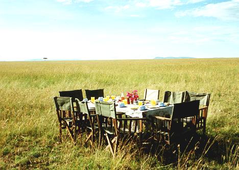 さて、しばしの空中遊泳を楽しんだあと、気球は大草原のど真ん中に静かに着陸。「うほーっすごいすごい」なんてわめいているうちに、草原の遙か彼方から2台の車が。そう、じつはこのバルーンツアー、「大草原のど真ん中での朝食つき」なのです。とはいっても座り込んでサンドイッチ食べるなんてちゃちなものではない。何と、テーブルから椅子からシャンパンからブーゲンビリアのテーブルフラワーから、何から何まで本格的にやってしまおうという、日本では想像もできないほど無茶苦茶本格的なBreakfastなのであります。