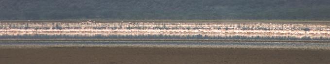 Nakuru湖といえばフラミンゴが何よりも有名です。が、この時期(3月下旬)はシーズンオフゆえ数は少なく、せいぜい3万羽だろうとのことでした。雨期には100万羽を越えるよ、といわれてぶったまげました。その頃には湖がピンクに染まるそうな。でもこの時は精一杯望遠で撮っても遙かかなたにこれくらい。何だか悲しくなりました。