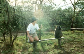 ナクル湖を見下ろす展望台では車から降りることができる。ハイラックスの写真もそこで撮ったものなのだが、ここに1匹のバブーンがいた。せっかくの間抜けなシャッターチャンスなので意を決して撮ってもらうことにしたTakemaだが、どうしても前が向けない!アンボセリでガイドが「バブーンは凶暴です」なんていってたのをなまじ覚えていただけに、真正面を向いた途端に飛びかかったりしたらどうだろうと思ってしまったのだ(相手は野生だから何考えてるかわからないしね)。結局は自分の意気地なしを露呈しただけの写真になってしまった(^_^;)。